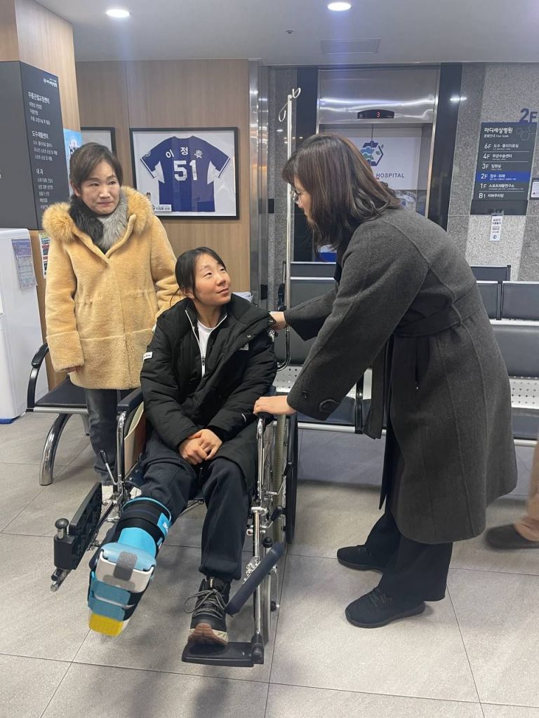 장미란 문화체육관광부 제2차관이 11일 산악스키 김하나 선수를 만나 위로를 전하고 쾌유를 기원하고 있다. [사진 제공= 문화체육관광부]