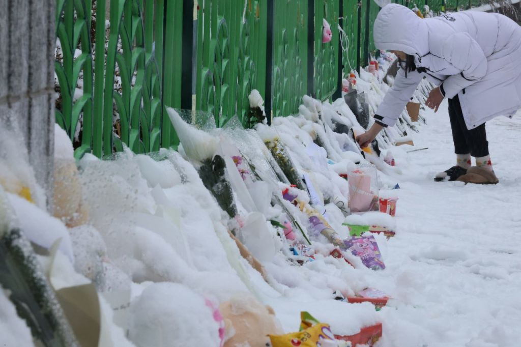 12일 오전 대전 초등학생 김하늘 양 피살사건이 발생한 대전 서구의 한 초등학교 정문에서 한 시민이 추모의 의미로 국화꽃을 놓아두고 있다. 연합뉴스