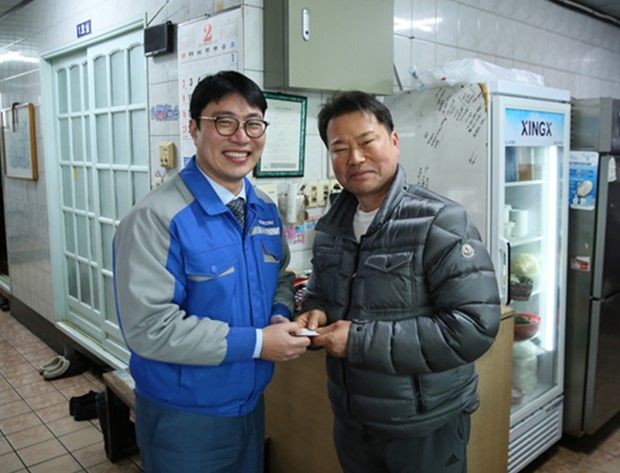 태웅 허욱 사장(왼쪽)이 직원 식비 선결제를 하고 활짝 웃고 있다.
