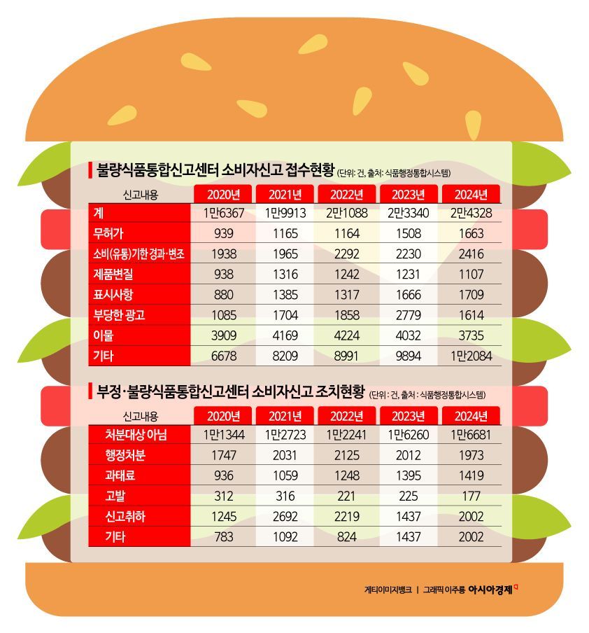 최근 5년간 부정·불량식품 신고 건수가 급증했지만 실제 처분으로 이어지는 비율은 상대적으로 낮은 것으로 나타났다.
