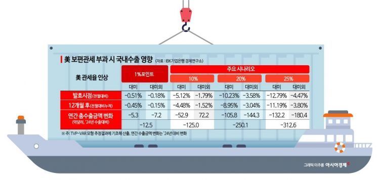 보고서는 만약 미국의 관세율이 1% 인상된다면 12개월 후 우리 대미 수출은 0.45%, 미국 외 수출은 0.15% 각각 줄어들며, 우리 연간 총수출이 작년 대비 12억5000만달러(1조8000억원) 감소할 것으로 예측했다. 미국이 중국에 부과한 요율인 10%를 한국에도 적용한다면 연간 총수출은 작년 대비 125억달러(18조원) 줄어든다. 만약 멕시코와 캐나다처럼 20% 이상 관세가 부과된다면 한국의 총수출은 36조원 이상 감소한다.