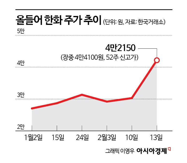 14일 한국거래소에 따르면 한화는 전일 11.80% 오른 4만2150원에 마감했다. 장중 4만4100원까지 오르며 52주 신고가를 다시 썼다. 최근 3일 연속 급등세를 이어가는 모습이다. 3일간 상승폭은 39%에 달했다. 한화의 주가가 4만원대에 올라선 것은 2018년 5월 이후 처음이다.