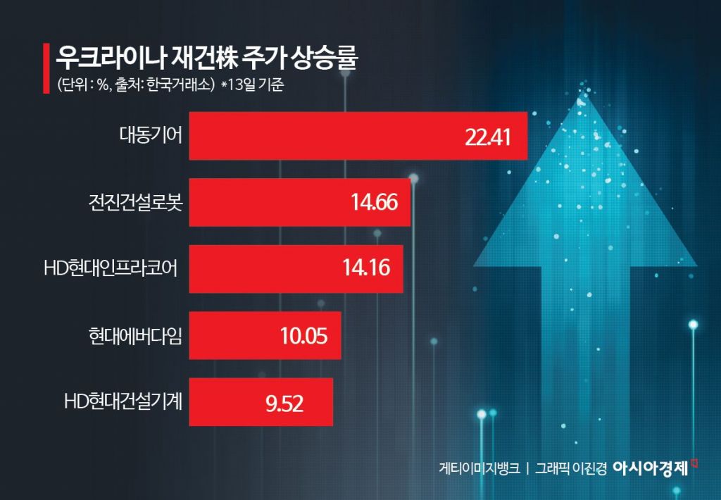 13일 일제히 상승 마감한 국내 증시에서 주인공은 단연 우크라이나 재건주들이었다. 특히 우크라이나의 농기계 수입 총판과 트랙터 공급계약을 맺은 대동기어(22.41%)가 52주 신고가를 경신하며 선봉에 섰다. 종합기계회사인 HD현대인프라코어(14.16%), 소방차 제조업체 현대에버다임(10.05%), 건설장비업체 HD현대건설기계(9.52%) 등 현대그룹계열사도 줄줄이 신고가 행렬에 합류했다.