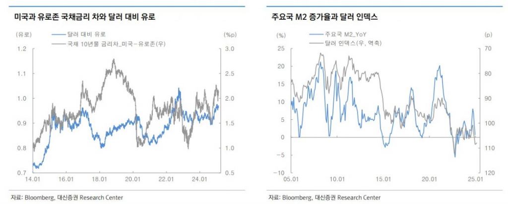 조 연구원은 "과거 주요국 M2 증가율이 둔화되면 달러는 강세를 보였다. 하지만 2022년 10월 저점 이후 개선되던 주요국 M2 증가율은 최근 3개월 연속 둔화하고 있다"고 설명했다. 특히 이는 인플레이션 재반등 우려로 Fed의 추가 금리 인하 기대감이 약해진 현 상황과 맞물려 달러 약세 흐름을 제한하고 있다는 평가다. 그는 "당분간 달러의 추세적 약세를 기대하기는 환경"이라고 판단했다.