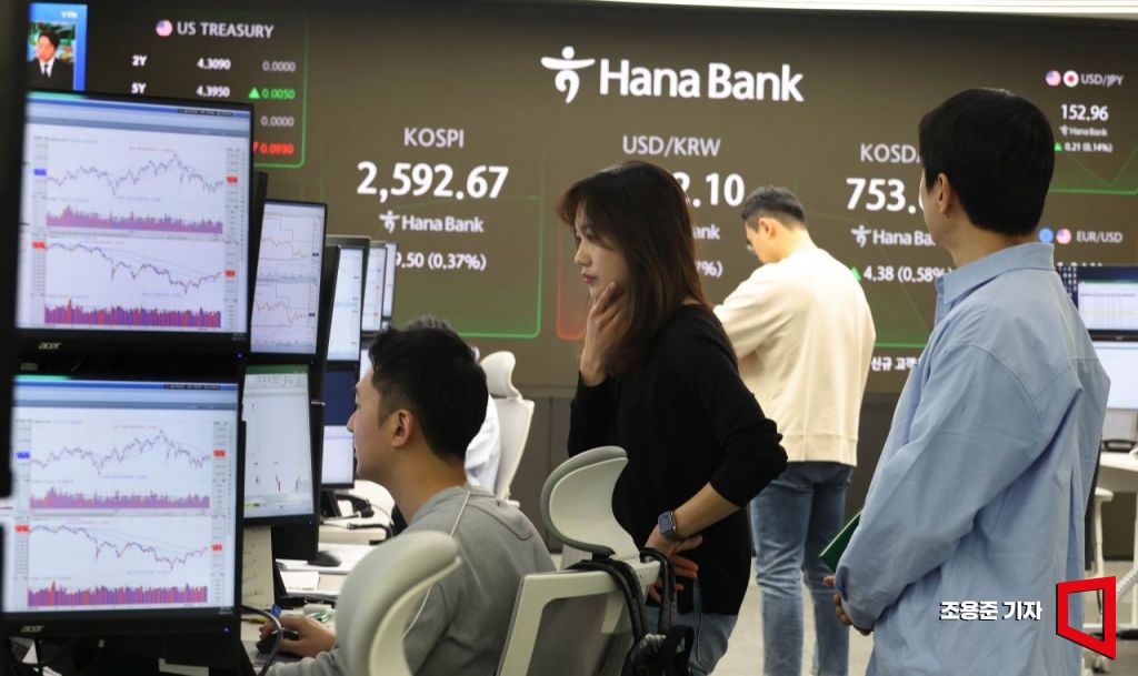 미국 상호관세 불확실성 제거로 뉴욕 증시 동반 강세를 보인 14일 서울 중구 하나은행 딜링룸 직원들이 분주하게 업무를 보고 있다. 이날 코스피는 전장보다 6.42포인트(0.25%) 오른 2,589.59로, 원/달러 환율은 6.20원 내린 1,441.30원에 장을 시작했다. 2025.2.14 조용준 기자