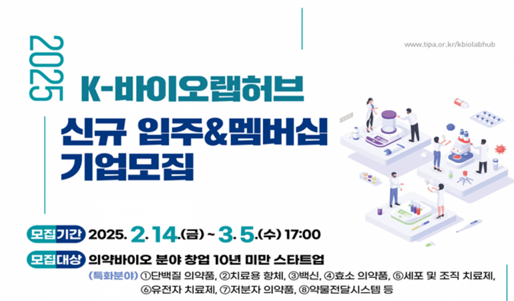 중소기업기술정보진흥원 K-바이오랩허브사업추진단은 인천경제자유구역청과 함께 의약·바이오 분야 혁신 스타트업 육성을 위한 신규 입주·멤버십기업을 모집한다고 14일 밝혔다.