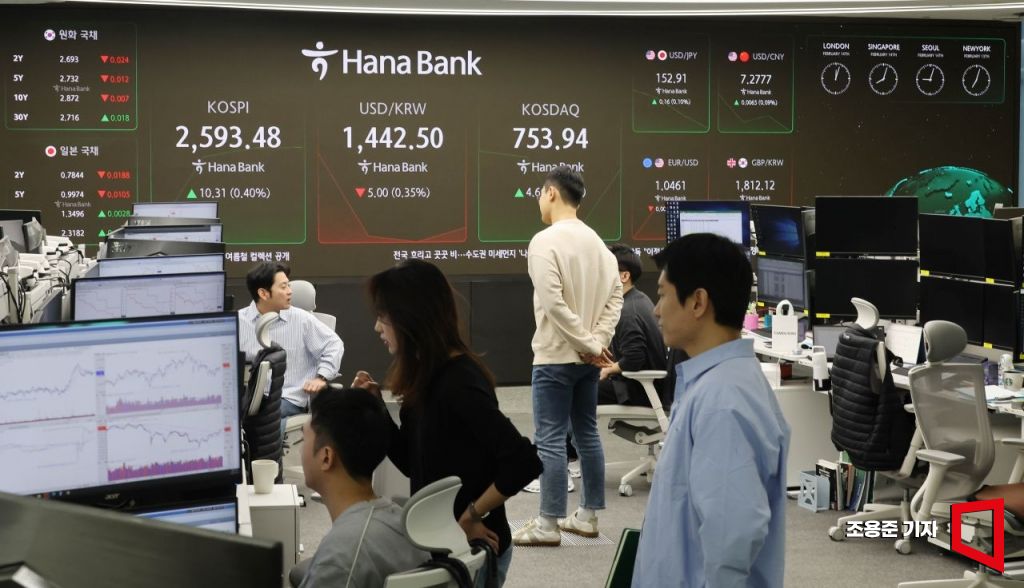 미국 상호관세 불확실성 제거로 뉴욕 증시 동반 강세를 보인 14일 서울 중구 하나은행 딜링룸 직원들이 분주하게 업무를 보고 있다. 이날 코스피는 전장보다 6.42포인트(0.25%) 오른 2,589.59로, 원/달러 환율은 6.20원 내린 1,441.30원에 장을 시작했다.