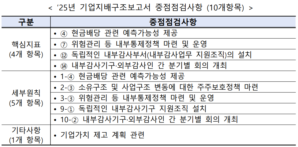 기업지배구조 보고서 핵심 지표 중에는 ▲현금배당 관련 예측 가능성 제공 ▲위험관리 등 내부통제정책 마련 및 운영 ▲독립적인 내부감사부서(내부감사업무 지원조직)의 설치 ▲내부감사기구·외부감사인 간 분기별 회의 개최가 중점 점검 사항으로 선정됐다. 세부 원칙에서는 위 4개 항목에 더해 ▲소유구조 및 사업구조 변동에 대한 주주 보호정책 마련이 추가된다.