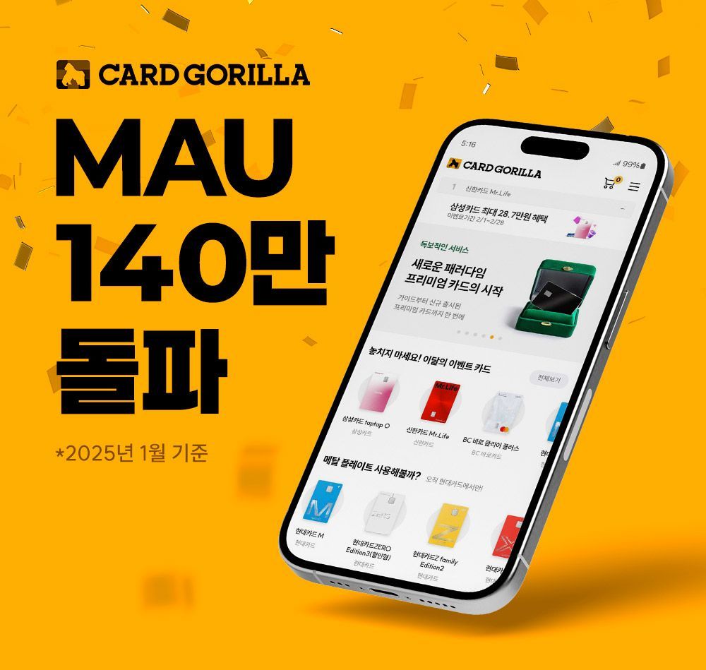 국내 최대 신용카드 플랫폼 카드고릴라가 역대 최다 월간 활성 이용자 수(MAU)를 돌파했다.