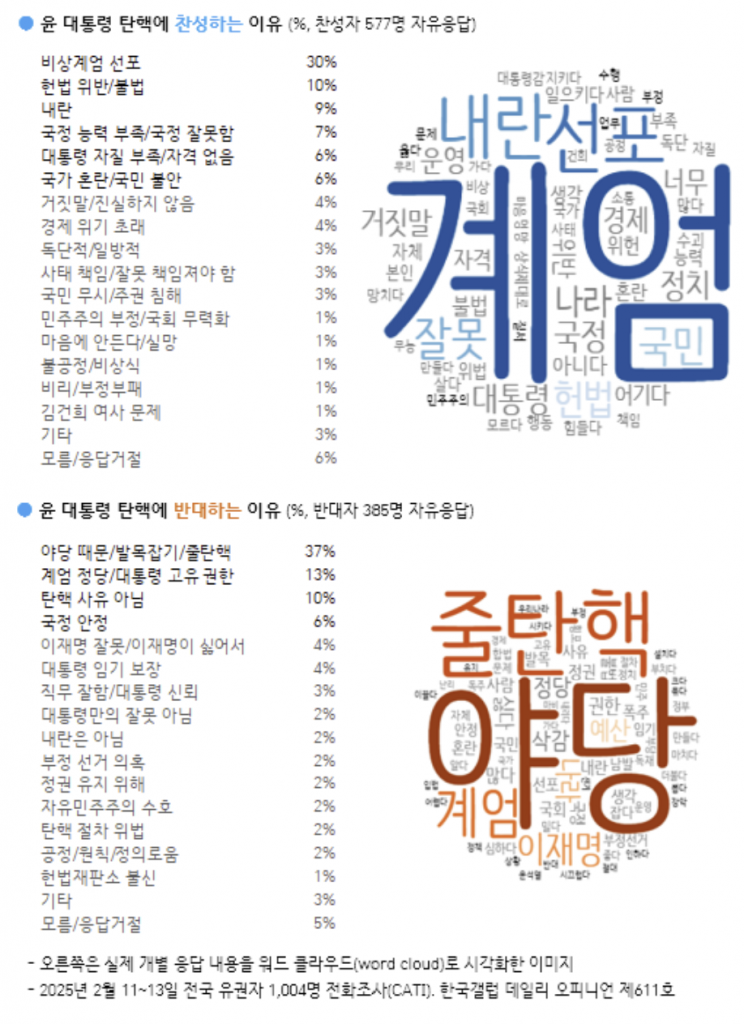 탄핵에 찬성한 응답자(577명, 자유응답)는 '비상계엄 선포'(30%), '헌법 위반·불법'(10%), '내란'(9%), '국정 능력 부족·국정 잘못함'(7%) 등을 이유로 꼽았다. 반대한 응답자(385명, 자유응답)는 '야당(민주당) 때문·발목잡기·줄탄핵'(37%), '계엄 정당·대통령 고유 권한'(13%), '탄핵 사유 아님'(10%) 등을 이유로 제시했다.