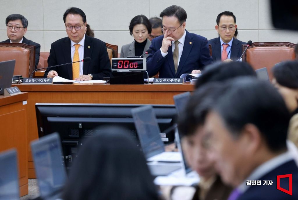 조규홍 보건복지부 장관과 박민수 2차관이 14일 국회에서 열린 보건복지위원회 전체회의에 참석하고 있다.