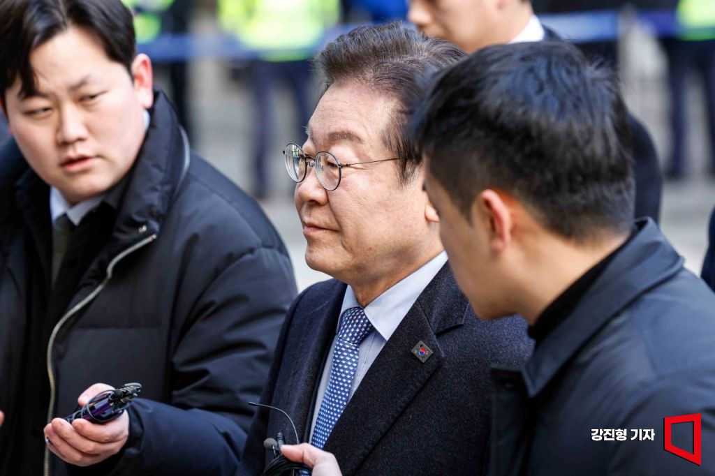 대장동 배임 및 성남FC 뇌물 혐의를 받고 있는 이재명 더불어민주당 대표가 14일 서울 서초구 서울중앙지방법원에서 열린 공판에 출석하고 있다.