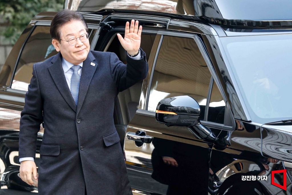 대장동 배임 및 성남FC 뇌물 혐의를 받고 있는 이재명 더불어민주당 대표가 14일 서울 서초구 서울중앙지방법원에서 열린 공판에 출석하며 지지자들에게 손 인사하고 있다.