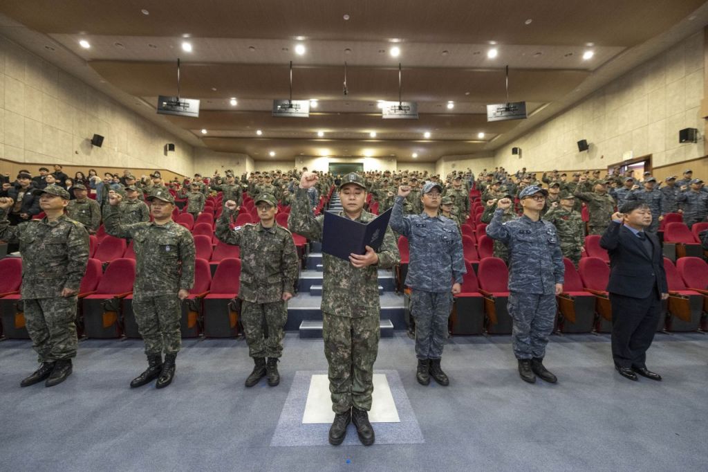 해군교육사령부 장병들이 리스펙 선포식에서 결의를 다지고 있다.