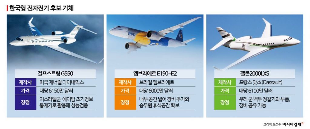 대한항공과 KAI가 눈여겨보고 있는 기체는 미국 걸프스트림 G550, 브라질 엠브라에르 E190-E2, 프랑스 닷소 팰콘2000LXS 등이다. 걸프스트림 G550는 이스라엘군이 에이탐 조기경보통제기 등 기체로 활용해 성능이 검증됐다는 장점이 있다. 팰콘2000LXS는 우리 군 백두 정찰기에 쓰이고 있다. 부속을 공유할 수 있어 후속 군수지원에 효율적이다. E190-E2는 내부 공간이 타기체보다 넓다. 장비를 추가할 수 있고, 오랜 비행시간에 지친 승무원의 휴식을 보장할 수 있다.