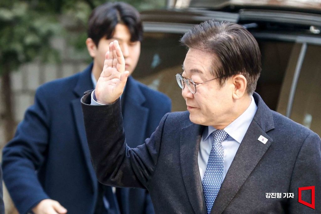 대장동 배임 및 성남FC 뇌물 혐의를 받고 있는 이재명 더불어민주당 대표가 14일 서울 서초구 서울중앙지방법원에서 열린 공판에 출석하며 지지자들에게 손 인사하고 있다. 2025.2.14. 강진형 기자