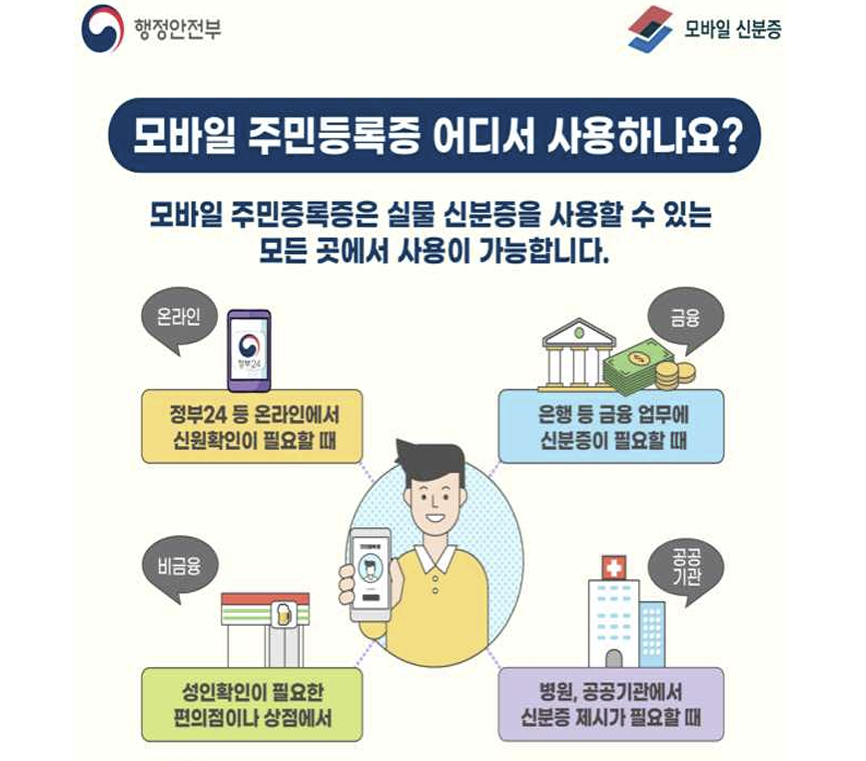 모바일 주민등록증은 휴대전화 앱에 저장돼 행정기관, 금융기관, 병원 등에서 실물 주민등록증과 똑같이 사용할 수 있다.