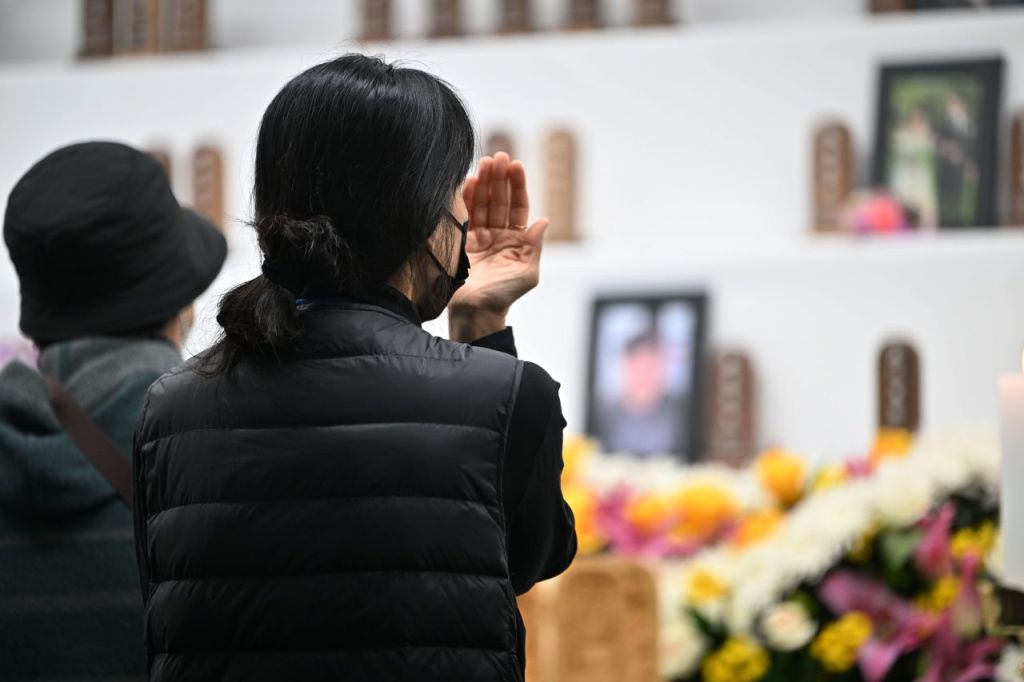 제주항공 여객기 참사 49일째인 15일 오전 전남 무안국제공항 분향소에서 열린 49재 합동위령제에서 유족들이 눈물을 흘리고 있다. 연합뉴스