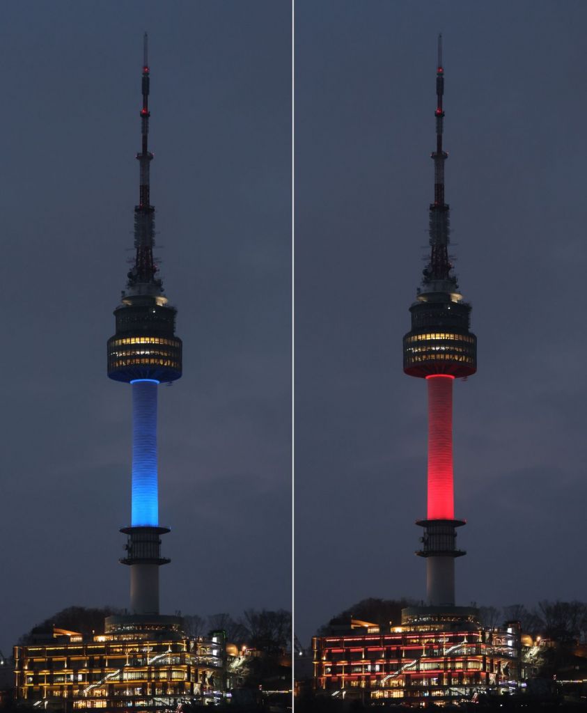 15일 서울 남산서울타워에 한국과 일본의 국기를 상징하는 파란색과 빨간색이 번갈아 비춰지고 있다. 연합뉴스