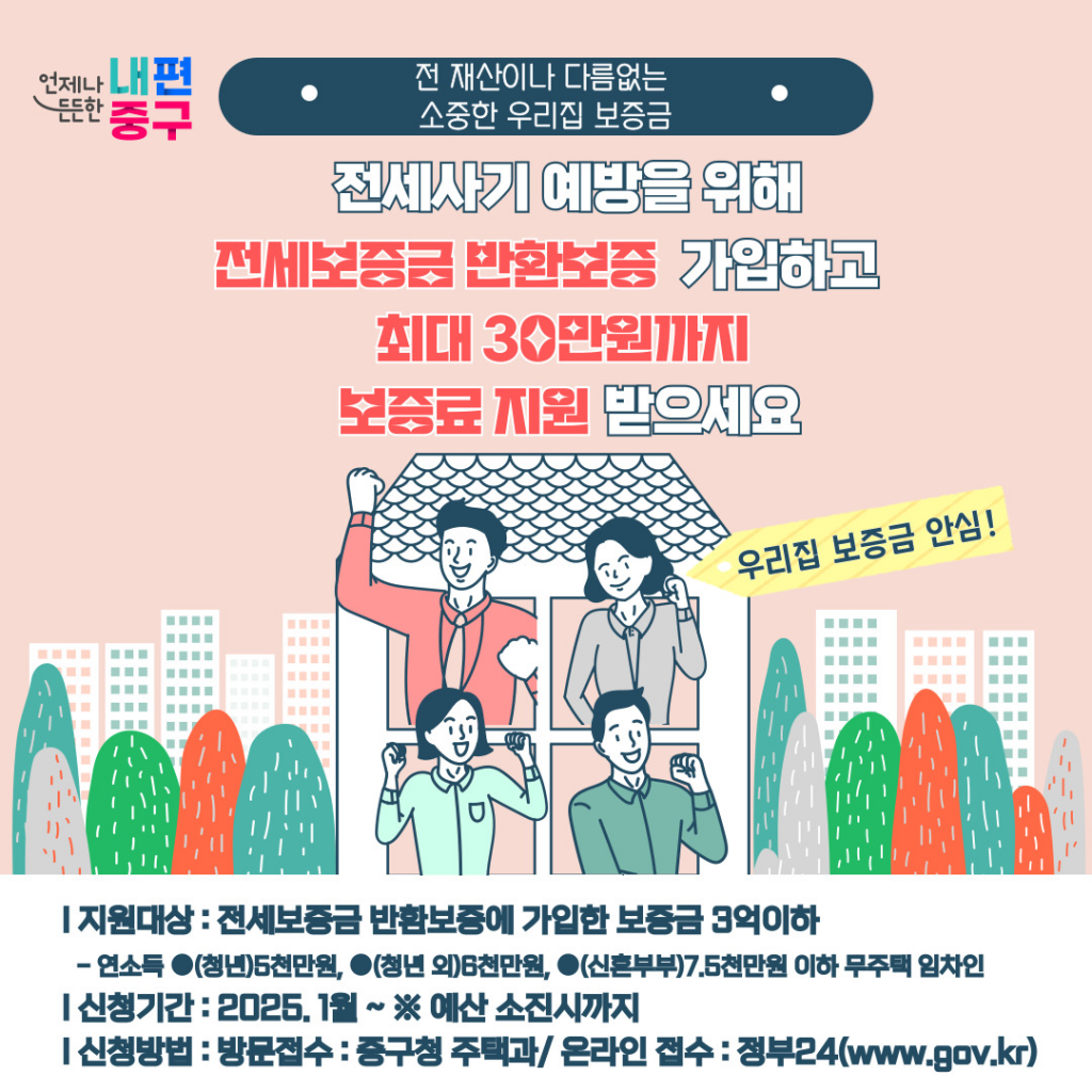서울 중구(구청장 김길성)는 전세 사기 피해를 막고 서민 주거 안정을 돕기 위해 무주택 임차인을 대상으로 ‘전세보증금반환보증 보증료’를 지원한다.