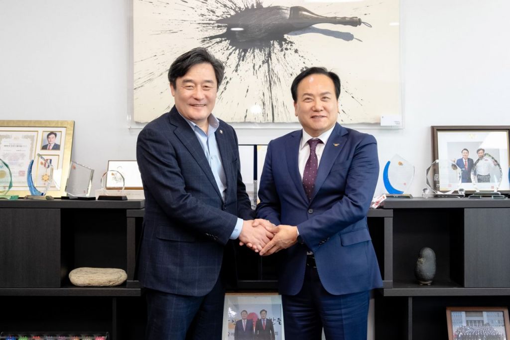 이권재(오른쪽) 오산시장이 정동만 국민의힘 의원실을 찾아 세무서 신설, 기준인건비 상향 등 시 현안에 대한 협조를 요청하고 있다. 오산시 제공