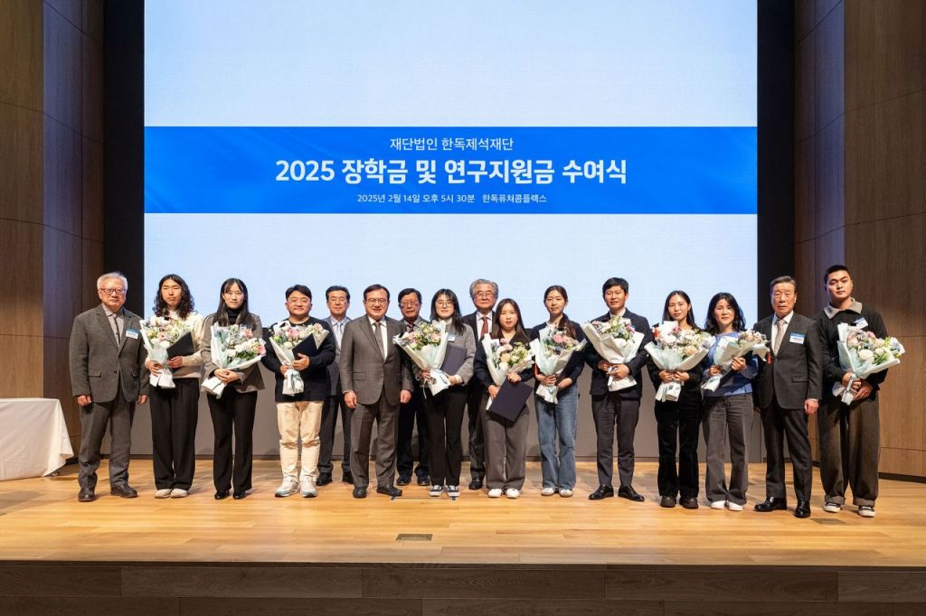 지난 14일 서울 마곡에 위치한 한독퓨처콤플렉스에서 열린 '제18회 한독제석재단 장학금 및 연구지원금 수여식'에서 참석자들이 기념촬영을 하고 있다. 한독제석재단 제공