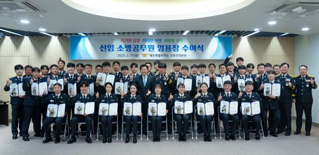 제주특별자치도 소방안전본부는 17일 오전 도청 삼다홀에서 제39기 신임 소방공무원 임용식을 개최했다. 오영훈 지사는 37명의 신임 소방 공무원들에게 직접 임용장을 수여했다.