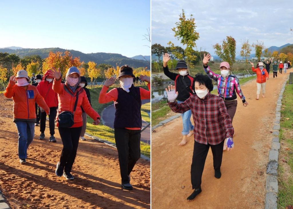 전남 장성군 주민들이 황룡강 황미르랜드에서 걷기운동을 하고 있다. 장성군 제공