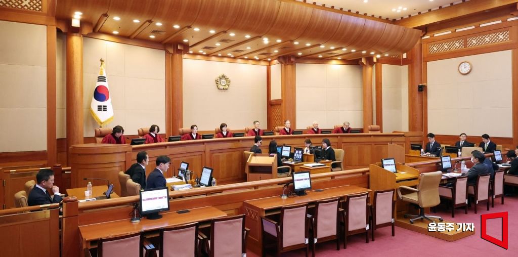 문형배 헌법재판소 소장 권한대행을 비롯한 헌법재판관들이 17일 서울 종로구 헌법재판소 대심판정에서 열린 이창수 서울중앙지검장, 조상원 중앙지검 4차장, 최재훈 중앙지검 반부패수사2부장 탄핵 심판 첫 정식 변론에 참석해 자리하고 있다.