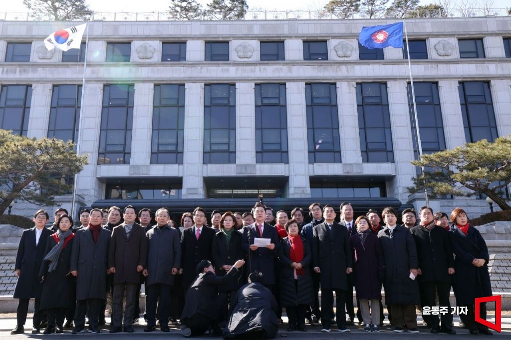 17일 서울 종로구 헌법재판소 앞에서 김기현, 나경원, 윤상현 국민의힘 의원을 비롯한 여당 의원들이 윤석열 대통령 최소한 방어권 보장 촉구 및 불공정성 규탄과 관련해 헌법재판소 사무처장을 면담하기에 앞서 기자회견을 하고 있다. 2025.02.17 윤동주 기자