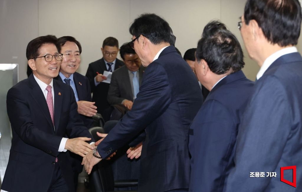 김문수 고용노동부 장관이 17일 서울 여의도 중소기업중앙회에서 열린 고용노동부 장관 초청 중소기업인 간담회에 참석, 인사를 나누고 있다.