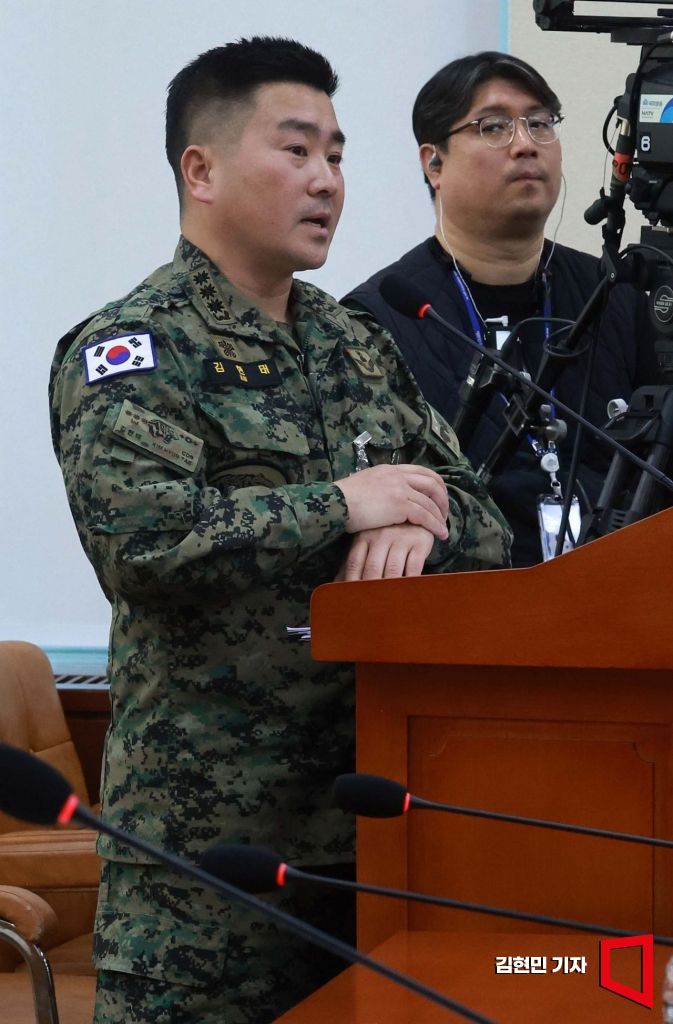 김현태 707특수임무단장이 17일 국회 국방위원회 전체회의에서 여당 위원들의 질의에 답하고 있다. 이날 회의는 더불어민주당 의원들의 회유 의혹과 관련해 성일종 위원장 직권으로 야당 의원들이 불참한 가운데 열렸다.