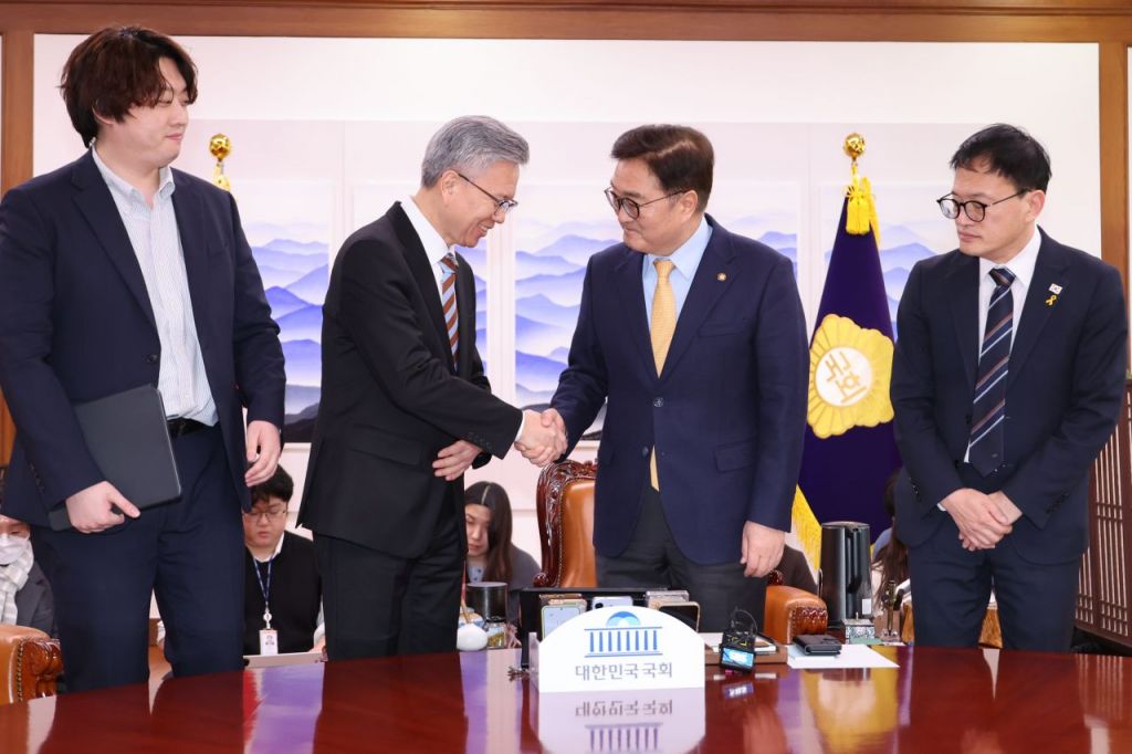 우 의장은 이날 접견에서 "의료계와 정부의 입장차가 줄어들지 않아 어려움을 겪는 것으로 안다"며 "국정운영에 무한한 책임을 지는 정부와 여당이 더 유연성을 갖고 대화하면 해결하지 못할 문제가 없다고 주장해 왔음에도 사태가 이렇게 이어지는 것이 참으로 안타깝다"고 말했다.