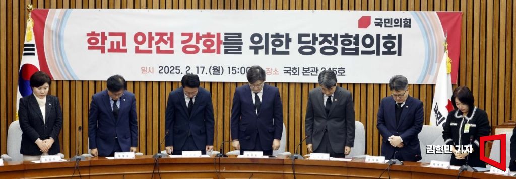 권성동 국민의힘 원내대표와 이주호 사회부총리 겸 교육부 장관이 17일 국회에서 열린 학교 안전 강화를 위한 당정협의회에 앞서 고 김하늘양을 추모하는 묵념을 하고 있다. 2025.2.17 김현민 기자