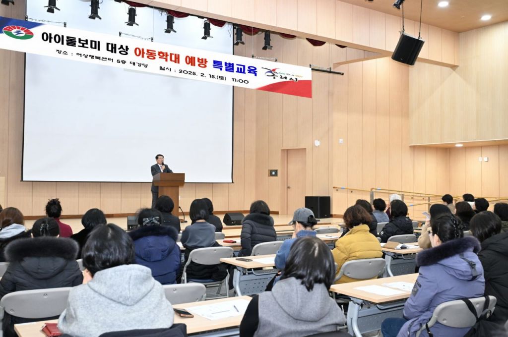 백경현 구리시장이 지난 15일 여성행복센터 5층 대강당에서 아이돌보미들을 대상으로 ‘아동학대 예방 특별교육’을 실시하고 있다. 구리시 제공