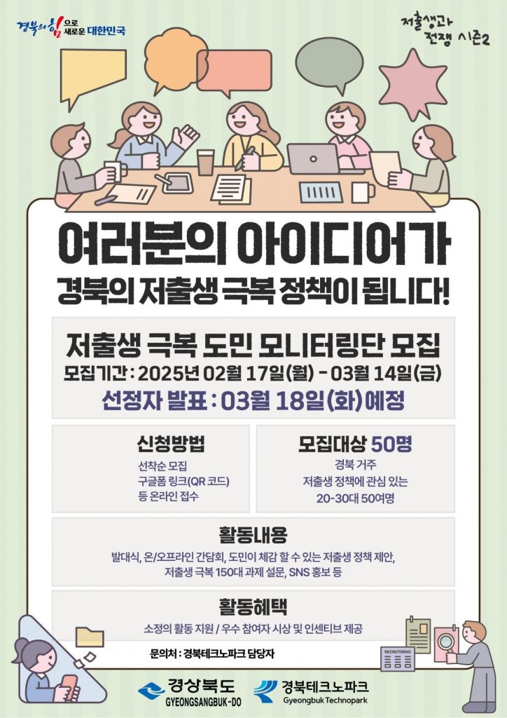 경북테크노파크는 3600억원의 예산이 투입된 저출생 극복 사업의 효과를 극대화하고 도민들의 목소리를 정책에 반영하기 위해 ′도민 모니터링단′을 모집한다.