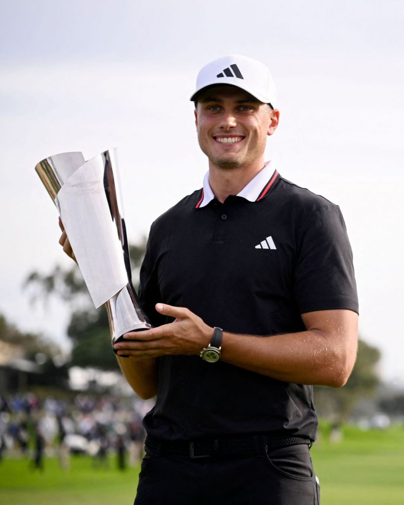 루드비그 오베리가 제네시스 인비테이셔널 우승 직후 트로피를 들고 환하게 웃고 있다. 샌디에이고=AFP·연합뉴스