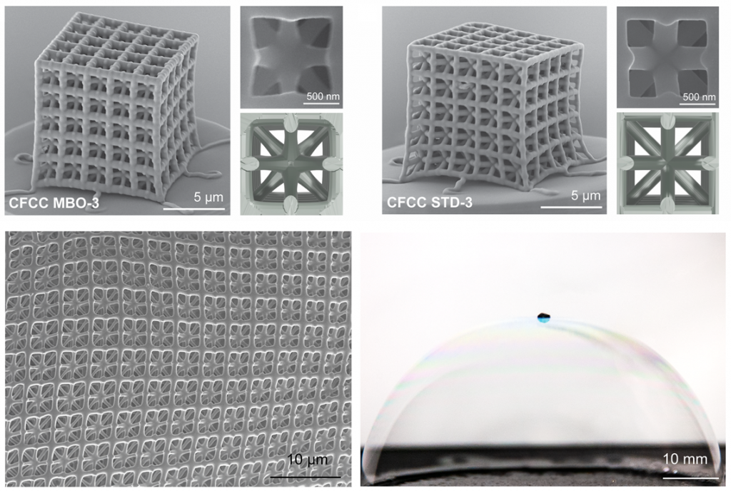 레이저 빔을 이용해 특정 파장의 두 개의 광자가 동시에 흡수될 때만 중합 반응이 일어나도록 하는 '이광자 중합(two-photon polymerization, 2PP) 기술'로 강철에 버금가는 강도와 스티로폼 수준의 경량성을 동시에 갖추도록 했고, '멀티포커스 이광자 중합(multi-focus 2PP) 기술'을 이용해 나노스케일의 정밀도를 유지하면서도 밀리미터 스케일의 구조물 제작이 가능함을 입증했다.