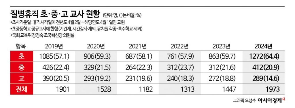 전체 질병 휴직 교사는 2019년 1901명에서 코로나19 팬데믹(세계적 대유행) 전후로 감소해 2021년 1182명까지 줄었다. 그러다가 다시 매년 증가(1313명→1447명→1973명)했는데, 이런 흐름을 주도한 학급은 초등학교였다. 같은 해 초등교사의 질병 휴직은 2019년 1085명에서 2021년 687명까지 감소했다가 3년 사이 두 배(1272명) 늘었다.