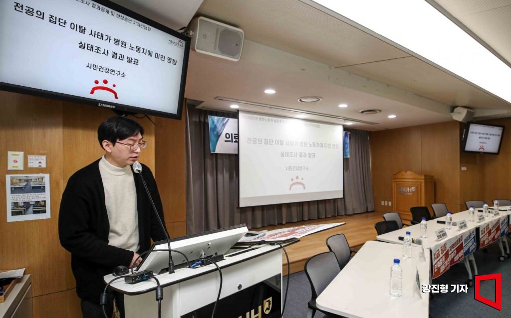정성식 시민건강연구소 연구원이 18일 서울 종로구 서울대학병원에서 '의료대란 1년, 병원 현장 어떻게 변했나'란 주제로 열린 '병원노동자 설문조사 결과 공개 및 현장증언 기자간담회에 참석해 설문조사 결과를 공개하고 있다.