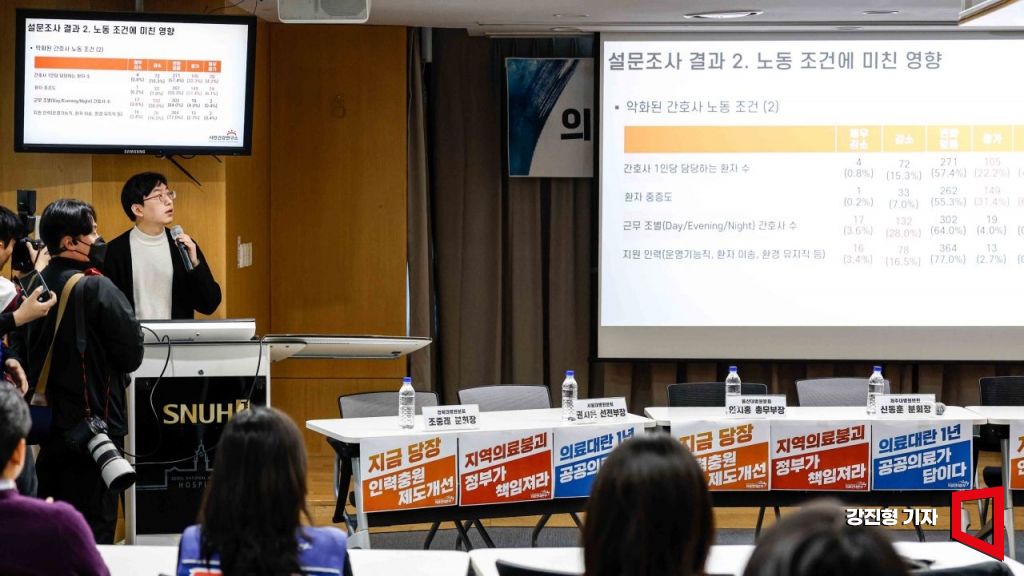 정성식 시민건강연구소 연구원이 18일 서울 종로구 서울대학병원에서 '의료대란 1년, 병원 현장 어떻게 변했나'란 주제로 열린 '병원노동자 설문조사 결과 공개 및 현장증언 기자간담회에 참석해 설문조사 결과를 공개하고 있다.