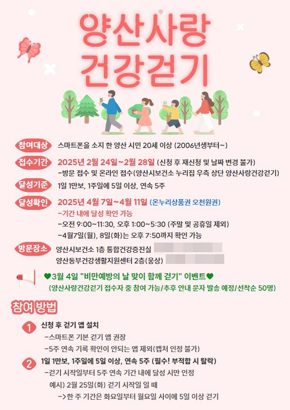 양산사랑 건강걷기 사업 참여 대상자는 양산시에 거주하는 20세 이상 시민이며, 방문과 양산시보건소 홈페이지 온라인 접수를 통해 참여 가능하다.