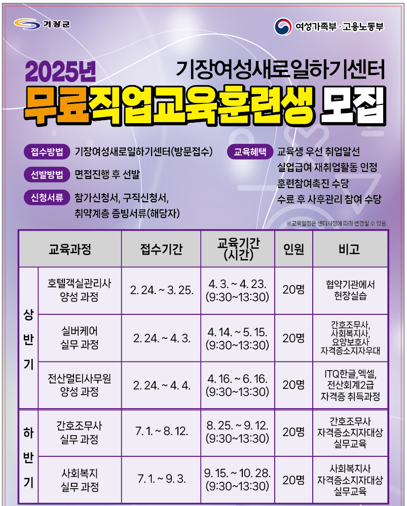 부산 기장군은 오는 24일부터 군 직영 ‘기장여성새로일하기센터’에서 ‘2025년 직업교육훈련’ 교육생을 모집한다고 18일 전했다.