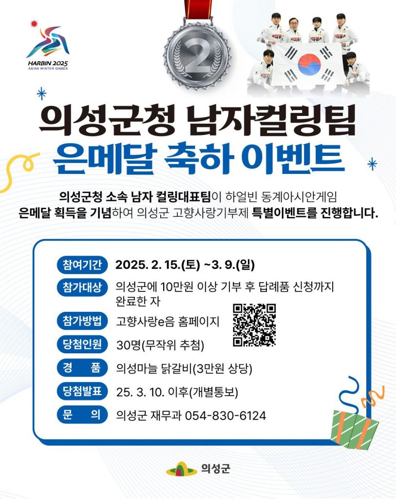 경북 의성군이 하얼빈 동계아시안게임에서 의성군청 남자컬링팀이 은메달을 획득한 것을 기념해 고향사랑기부제 특별 이벤트를 진행한다.