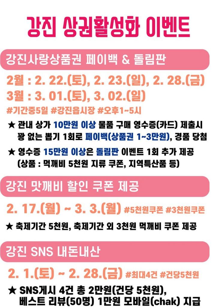 19일 군에 따르면 이번 이벤트는 상가 방문 및 소비 촉진 유도와 강진읍 상권의 활력을 불어넣기 위해 진행된다. 주요 이벤트로는 강진사랑상품권 영수증 페이백 이벤트, 꽝 없는 돌림판 이벤트, ‘강진맛깨비’ 먹깨비 할인 이벤트, SNS 내돈내산 특별 이벤트 등이 있다.