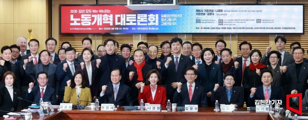 권영세 국민의힘 비상대책위원장과 김문수 고용노동부 장관과 등 참석자들이 19일 국회 의원회관에서 열린 '2030·장년 모두 Win-Win하는 노동개혁 대토론회'에서 기념촬영을 하고 있다. 2025.2.19 김현민 기자