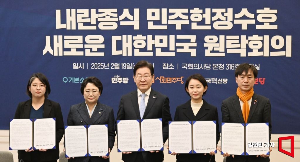 더불어민주당 이재명 대표를 비롯한 야5당 대표들이 19일 국회에서 열린 '내란 종식 민주 헌정 수호 새로운 대한민국 원탁회의' 출범식에서 공동선언문에 서명 후 기념 촬영하고 있다. 왼쪽부터 기본소득당 용혜인 대표, 조국혁신당 김선민 대표 권한대행, 더불어민주당 이재명 대표, 진보당 김재연 상임대표, 사회민주당 한창민 대표. 2025.2.19 김현민 기자