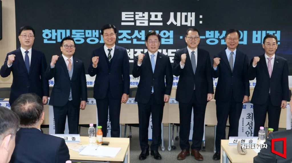 이재명 더불어민주당 대표가 19일 서울 마포구 한국방위산업진흥회에서 열린 '트럼프 시대 : 한미동맹과 조선산업·K-방산의 비전' 현장 간담회에서 참석자들과 기념촬영을 하고 있다. 이날 간담회에는 김희철 한화오션 대표, 최성안 삼성중공업 부회장, 이상균 HD현대중공업 대표 등 방산·조선업 관계자들이 참석했다.
