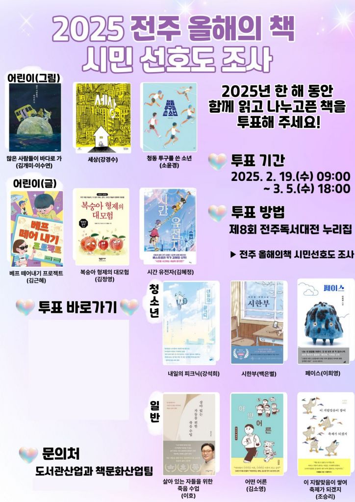 시민 선호도 조사는 온라인으로 진행되며, 전주독서대전 누리집을 통해 참여할 수 있다. 시는 후보도서 중 최다 득표를 받은 부문별 1권씩 총 4권을 ‘2025 전주 올해의 책’으로 최종 선정할 계획이다.