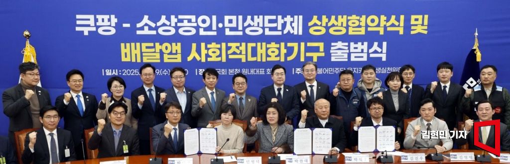 19일 국회에서 열린 쿠팡-소상공인·민생단체 상생협약 체결 및 배달앱 사회적대화기구 출범식에서 참석자들이 상생협약서를 들고 기념촬영하고 있다.